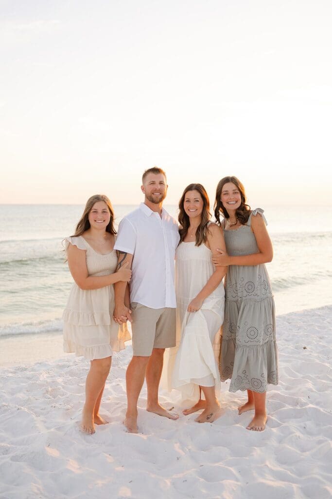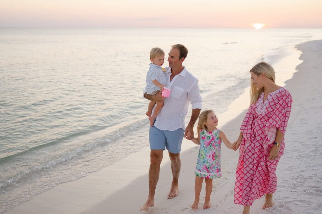 Choosing outfits can be overwhelming, but it doesn’t have to be. Neutral tones with a few subtle pops of color work beautifully against the natural backdrop of 30A’s beaches. Avoid bold patterns that can distract from your family’s faces. Need inspiration? Check out my blog on “What to Wear for a Beach Photoshoot.”